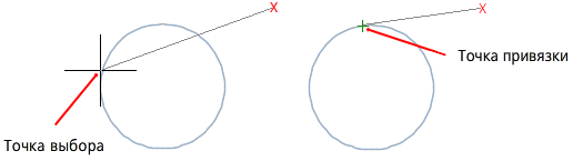 Привязка к месту пересечения касательной с дугой, окружностью, эллипсом, эллиптической дугой, дугой полилинии или сплайном.
