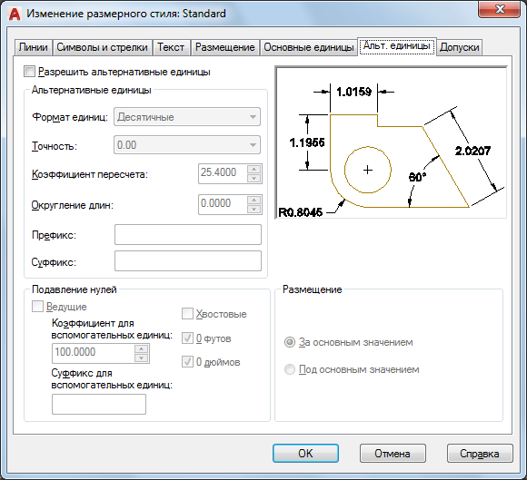 Определение коэффициента пересчета из основных единиц в альтернативные. Например, для преобразования дюймов в миллиметры ввести 25,4. Значение не оказывает влияния на угловые размеры и не применяется для точности округления или положительных и отрицательных допусков. (системная переменная DIMALTF)