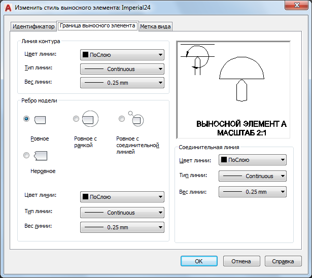 Определение свойств линии границы выносного элемента, ребра модели и соединительной линии выносных элементов.