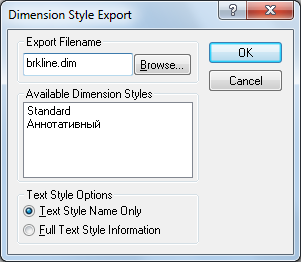 | Available Dimension Styles | Выбор размерных стилей для записи в файл ASCII. Отображается текущий размерный стиль. Каждый выбранный стиль записывается в файл, указанный в диалоговом окне "Имя файла для экспорта". |