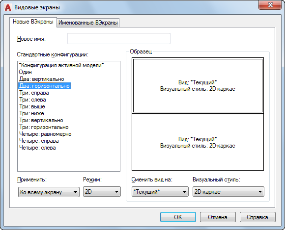 Имя новой конфигурации видовых экранов в пространстве модели. Если имя не вводится, конфигурация видовых экранов применяется, но не сохраняется. Если конфигурация видовых экранов не сохранена, ее нельзя использовать в пространстве листа.