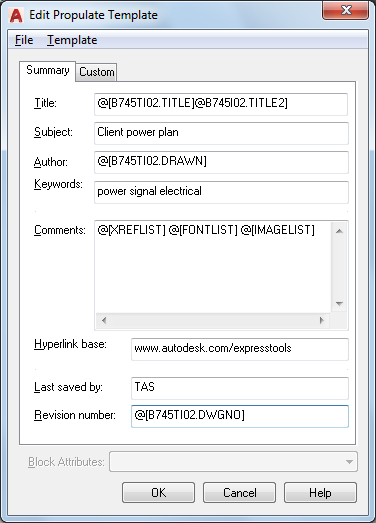 | @[block.attributeTag] | Извлечение значения тега атрибута из блока с атрибутами и его вставка в указанное поле. Например: вставка @[title.drawnby] в поле "Автор" заставит инструмент PROPULATE искать на чертеже блок с атрибутами с именем "title", извлечь значение поля атрибута "drawnby", и вставить его в поле "Автор" диалогового окна "Свойства чертежа" данного чертежа. Если в проекте используются обычные блоки, это простой и эффективный способ обновления большого количества чертежей конкретными значениями атрибутов. |