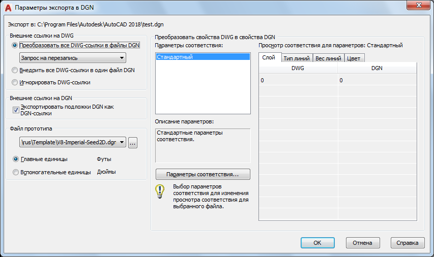 Файл прототипа для файла DGN подобен файлу шаблона чертежа (DWT), который содержит настройки по умолчанию и атрибуты, например рабочие единицы. Выбор соответствующего файла прототипа DGN (британские, метрические или определяемые пользователем единицы) и единиц преобразования является критическим для преобразования из DWG в DGN. Кроме того, файл прототипа содержит параметры, которые не присутствуют в файле DWG и, следовательно, наследуются в экспортируемом файле DGN.