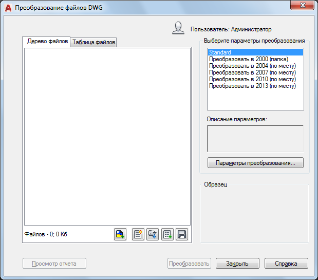 Открывает стандартное диалоговое окно выбора файлов, в котором можно выбрать файлы чертежей, добавляемых в список для преобразования. Эта кнопка находится как на вкладке "Дерево файлов", так и на вкладке "Таблица файлов".