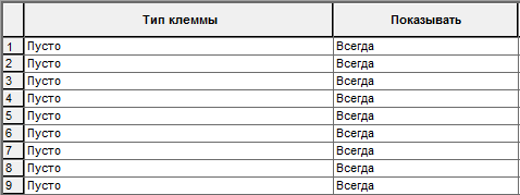 1. Откройте диалоговое окно "Редактор файлов базы данных ПЛК" и убедитесь в том, что значение "Показывать: Всегда" установлено для всех клемм.