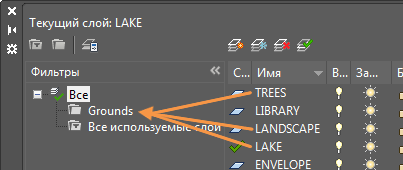 В этом примере мы создадим групповой фильтр слоев с именем Grounds и перетащим в него слои TREES, LANDSCAPE и LAKE.