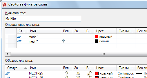Например, если требуется вывести список всех слоев, имена которых содержат буквы mech, введите *mech*.
