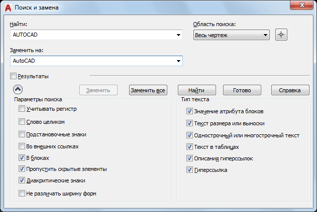 Выполнение поиска по всему чертежу, в текущем листе или среди выбранных объектов. Если объект уже выбран, по умолчанию принимается значение "Выбранные объекты". Если объекты не выбраны, по умолчанию принимается значение "Весь чертеж". Для того чтобы временно выйти из диалогового окна "Поиск и замена" и создать или изменить набор объектов, можно воспользоваться кнопкой "Выбрать объекты".