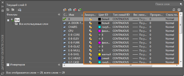 Переопределения слоев применяются к текущему видовому экрану листа. Если дважды щелкнуть видовой экран листа, чтобы сделать его текущим, в Диспетчере свойств слоев отобразятся дополнительные столбцы.
