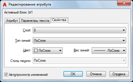 Задает слой, в котором атрибут будет включен, а также цвет, вес линии и тип линии атрибута. Если чертеж использует именованные стили печати, с помощью данной вкладки можно связать атрибут со стилем печати.