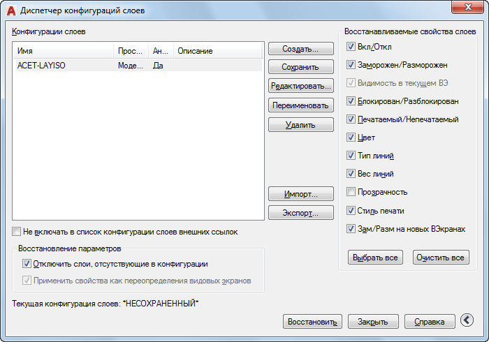 Конфигурации слоев, сохраненные в чертежах, вставленных как внешние ссылки, исключаются.