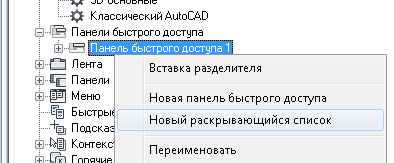 Новая панель быстрого доступа (с именем "Панель быстрого доступа1") помещается в конец списка узла панелей быстрого доступа.