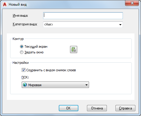 Сохранение нового именованного вида на основе того, что отображается на текущем видовом экране, или на основе выделения прямоугольной рамкой.