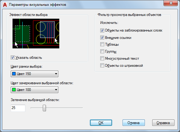 - Управление отображением эффектов для областей выбора. (системная переменная SELECTIONAREA)