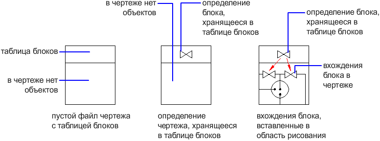 Блоком называется совокупность связанных объектов чертежа, обрабатываемых как единый именованный объект. При создании блока или вставке чертежа в качестве блока все сведения о блоке (включая геометрию, слои, цвета и типы линий) хранятся во внутренней таблице определений. Каждый вставляемый блок является, по сути, ссылкой на определение блока.