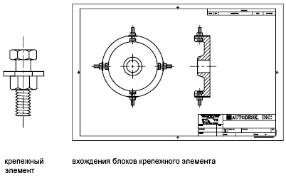 При вставке одного файла чертежа в другой чертеж информация из вставленного чертежа сохраняется в виде определения блока в таблице блоков чертежа назначения. Для последующих ссылок на это определение блока могут задаваться другие значения положения, масштабных коэффициентов и углов поворота, как это показано на следующем рисунке.