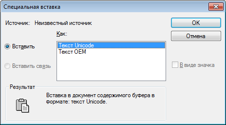 Содержимое буфера обмена помещается в текущую позицию курсора как внедренный объект.