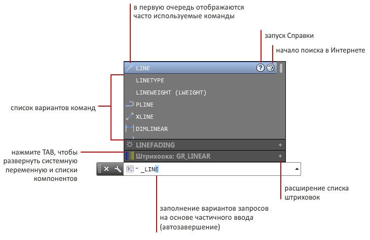 Список предлагаемых вариантов команд отображается при вводе первых букв команды в окне команд или в поле динамического ввода. По умолчанию список имеет следующие характеристики.