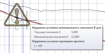 отображается рядом со строкой "Значение K", так как значение нарушает критерии проектирования. В окне чертежа и в виде "Объекты профиля" отображается нарушенная проверка проекта, однако отдельные параметры, которые не соответствуют проверке, не помечаются.