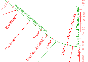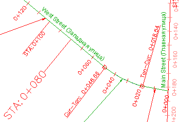 Обратите внимание на то, что в метках теперь используется один и тот же размер текста. Текст метки STA: 0+080 теперь имеет тот же размер, что и в метке STA: 0+000, так как свойство высоты текста родительского стиля переопределило соответствующее свойство дочернего стиля. Выравнивание линии осталось различным, так как точка прикрепления текста в дочернем стиле не была переопределена.