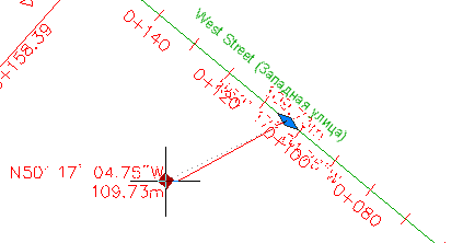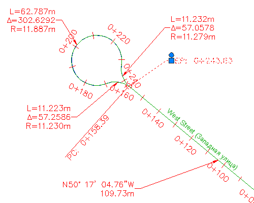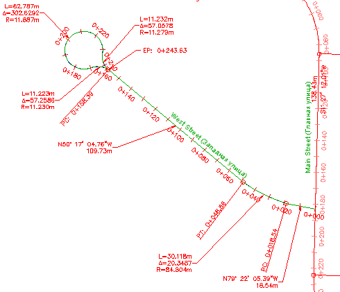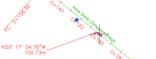 Обратите внимание на то, что выбрана и трасса Main Street (Главная улица), и трасса East Street (Восточная улица) вместе с метками пикетов этих трасс. Эти метки были выбраны потому, что они созданы в чертеже внешней ссылки, которому принадлежат трассы. Если объект создан с помощью функции внешней ссылки, редактирование его меток возможно только в исходном чертеже.