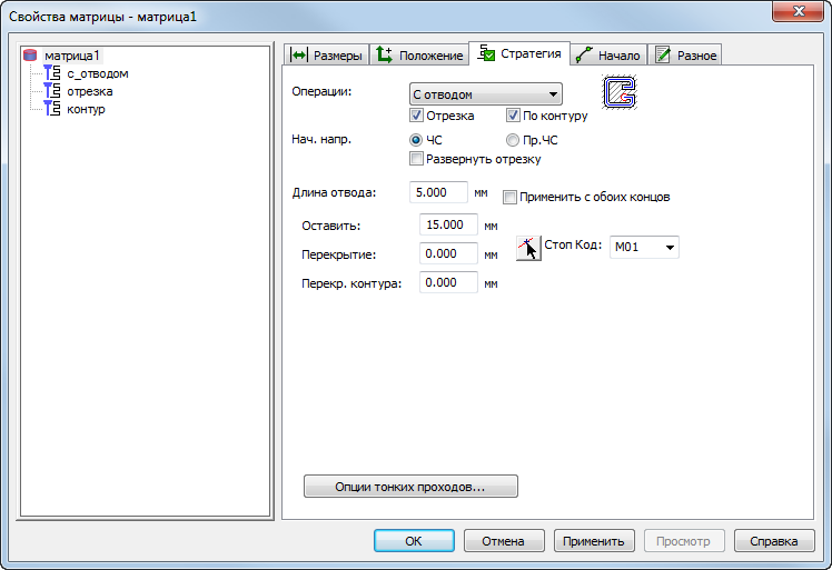 Длина отвода — Введите расстояние, на которое отводится проволока от детали в конце операции.