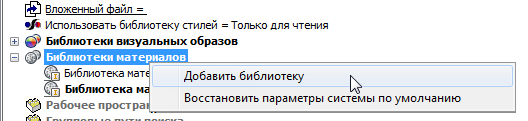 - Щелкните правой кнопкой мыши узел "Библиотека материалов" и нажмите кнопку "Добавить библиотеку".