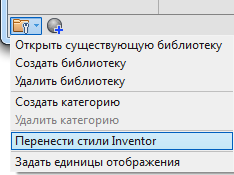 - На панели инструментов обозревателя выберите Перенести стили Inventor.