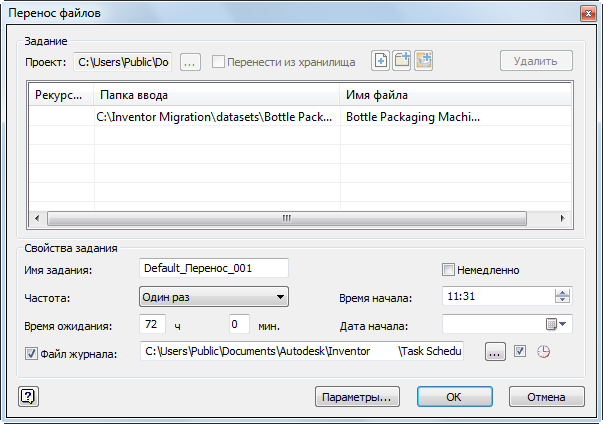 - Отложите перенос до окончания рабочего дня, когда все пользователи Inventor завершили работу. Для этого задайте требуемое время и дату в соответствующих полях.