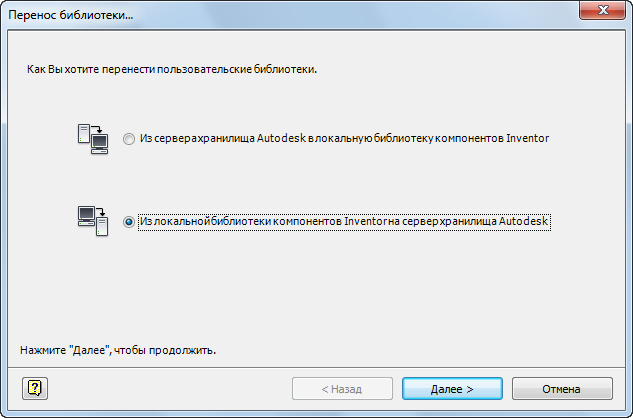 - Нажмите кнопку "Мастер переноса библиотек...", чтобы открыть соответствующее диалоговое окно. См. рисунок 2. Выберите "Из локальной библиотеки Inventor в Autodesk Vault Server".