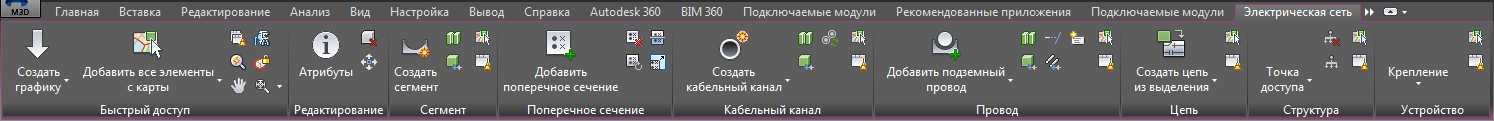 The Electric ribbon tab provides access to the most common operations in AutoCAD Map 3D Electric. For example, you can create a segment using the Segment panel, add a Cross Section using the Cross Section panel, and then add ducts and conductors using the Duct and Conductor panels. Use the Circuit panel to define circuits by selecting the feature or by performing a trace. Use the Structure and Device panels to add structures and devices. The features you create using the Electric ribbon tab are displayed in the appropriate containers in the Electric Explorer. See Electric Explorer.