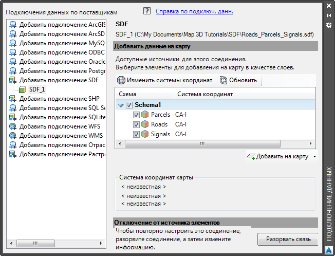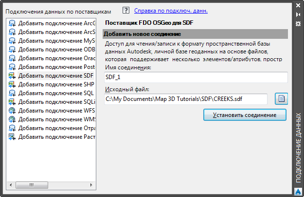 - В списке Подключения данных по поставщикам выберите Добавить подключение SDF.