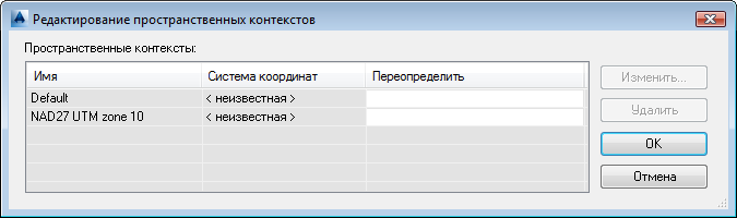 - Выберите Изменить системы координат и в диалоговом окне Редактирование пространственных контекстов выберите нужную запись и нажмите Правка.