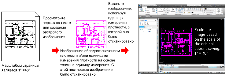 Следующий пример показывает отношение между масштабом листа, единицами измерения плотности и масштабом вставки изображения без геометрических данных (изображение, которое было сохранено без данных реальных единиц измерения). В эту категорию попадает любое изображение, которое было нарисовано с использованием масштаба (например, план этажа) и отсканировано.