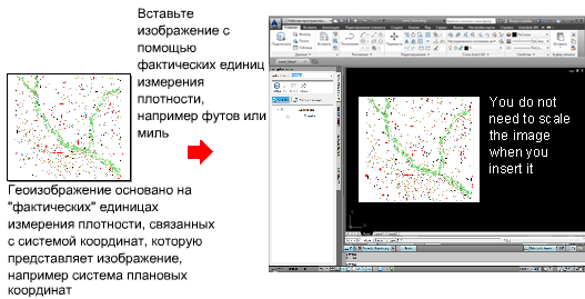 Заданная единица измерения плотности может отличаться в зависимости от типа вставляемого изображения. Следующие два примера приведены для объяснения различий между вставляемым отсканированным изображением, которое измеряется в точках на дюйм, и аэро/спутниковой фотографией, единицы измерения которой являются реальными.