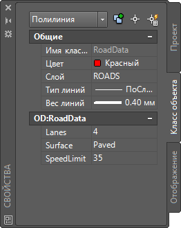 При выборе дороги на чертеже на вкладке "Класс объектов" будут отображаться все свойства, связанные с классом объектов "Дорога". Измените значение, щелкнув мышью в окне и выбрав элемент из списка.