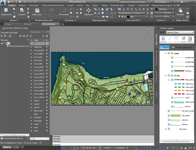 Эта карта содержит как слои AutoCAD (слева), так и слои Диспетчера отображения (справа).
