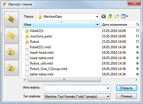 При выборе вкладки «Станок» > панель «Файл» > «Импорт» отображаются все существующие MTD-файлы: