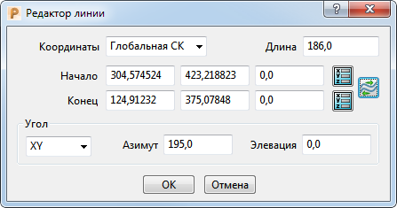 - Координаты — редактирует линию в глобальной СК, в рабочей плоскости или в относительных координатах. Относительная система координат имеет начало в начальной точке линии, а ее оси ориентированы по текущей СК.