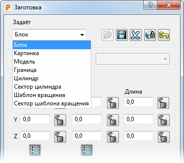 Блок — Используйте эту опцию, чтобы задать заготовку в виде прямоугольного блока, размеры которого могут быть заданы минимальными и максимальными координатами по X, Y, Z.