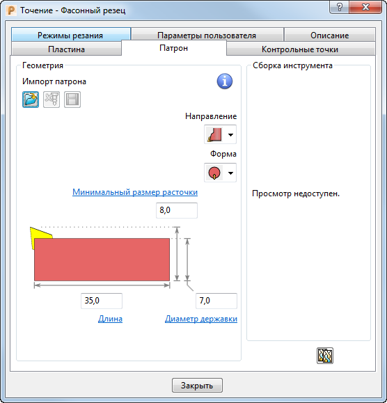 Вкладка Патрон диалога Инструмент задает участок патрона инструмента. Траектории избегают контакта модели с Патроном.