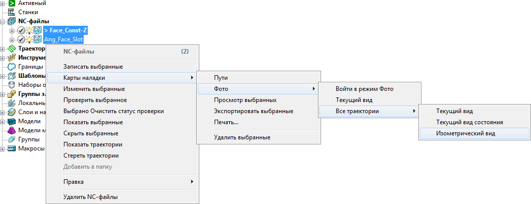 - В Проводнике выберите все необходимые NC-файлы и в контекстном меню выберите «Карты наладки» > «Фото» > «Все траектории» > «Текущий вид».