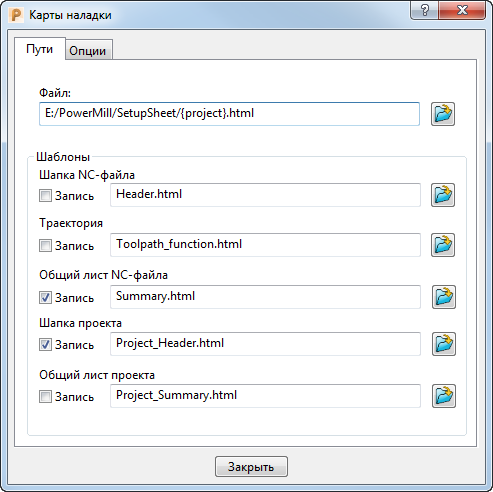 - Оставить набор шаблонов по умолчанию и задать, какие из шаблонов будут использоваться при создании карт наладки с помощью опций Запись. Например, если вам нужна только страница с шапкой проекта и общие листы NC-файлов, то снимите выбор с опции Запись для Header.html, Toolpath.html и Project_Summary.html.