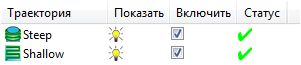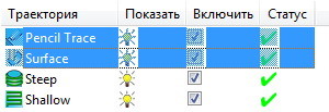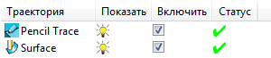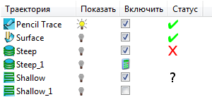«Таблица траекторий» — отображает все траектории, использующие этот инструмент, и показывает, может ли инструмент обрабатывать деталь без столкновений. Таблица содержит четыре столбца: