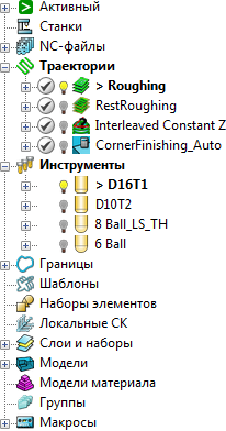 При создании объектов, таких как траектории, нужно выбирать другие объекты, такие как инструмент, рабочая плоскость, граница/шаблон и, если траектория должна постпроцессироваться, NC-файл. Если эти другие объекты активны, то они будут выбраны автоматически.