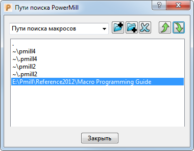 Для добавления нового пути поиска макросов выберите опцию Пути поиска макросов в контекстном меню макроса. Откроется диалоговое окно «Пути поиска PowerMill».