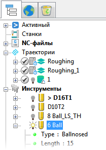 Проводник показывает объекты, используемые в проекте PowerMill. (Термин объект распространяется на все записи в Проводнике.) Объекты в Проводнике группируются вместе по типу. Например, траектории группируются в ветвь Траектории, а инструменты группируются в ветвь Инструменты. Так как проект PowerMill часто содержит множество объектов, проводник использует систему Активный