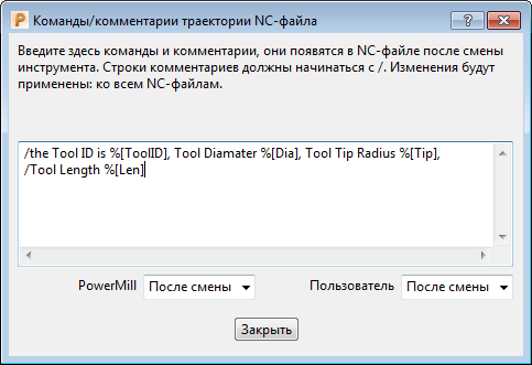 Также вы можете использовать переменные в диалоге Команды/Комментарии NC-файла, нажав на кнопку Комментарии на вкладке Траектория в Параметрах NC-файлов):