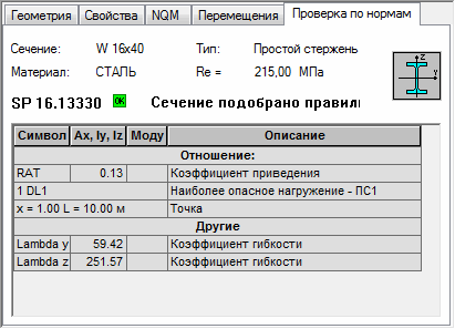 При выборе вкладки "Проверка по нормам" начнется проверка выбранного стержня конструкции. В ходе проверки стержня используются следующие параметры:
