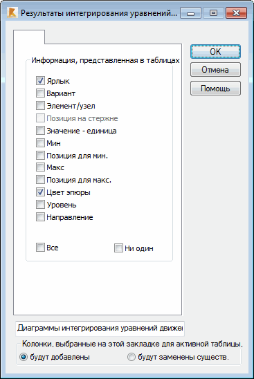 Представленное выше диалоговое окно позволяет выбрать необходимые величины для представления в таблице, расположенной под диаграммой. Функции описывают представленную диаграмму и позволяют отобразить характерные значения величин, полученных при расчете конструкции.